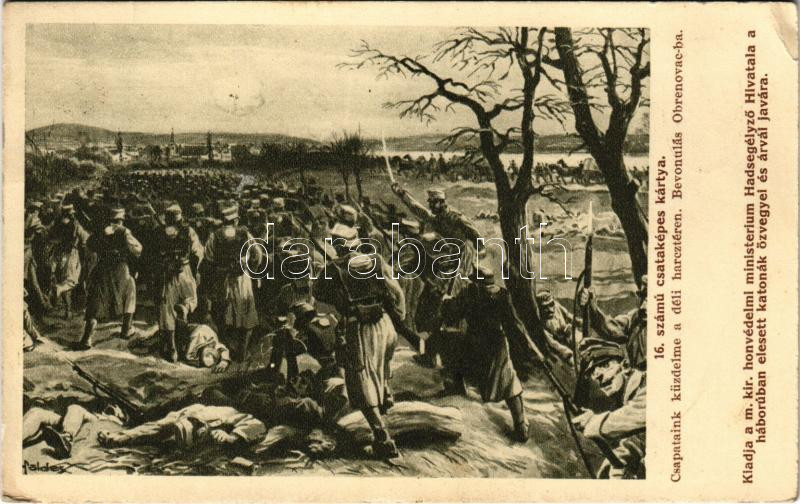 Description: 1915 16. számú csataképes kártya. Csapataink küzdelme a déli harctéren. Bevonulás Obrenovac-ba. Kiadja a m. kir. honvédelmi minisztérium Hadsegélyező Hivatala / WWI Austro-Hungarian K.u.K. military art postcard s: Földes (EK)