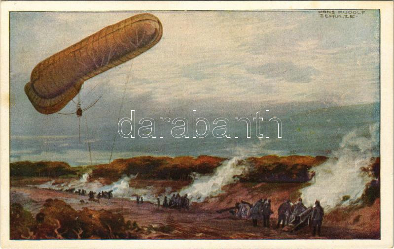 Description: Fesselballon, unsere Artilleriewirkung beobachtend. Deutscher Luftflotten-Verein / WWI German military art postcard, observation balloon s: Hans Rudolf Schulze