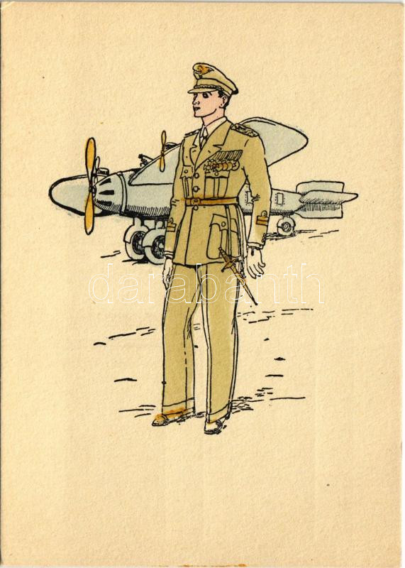 Description: Magyar pilóta repülőgéppel. Kiadja a Délvidéki Egyetemi és Főiskolai Hallgatók Egyesülete / WWII Hungarian military art postcard, pilot with aircraft (EK)
