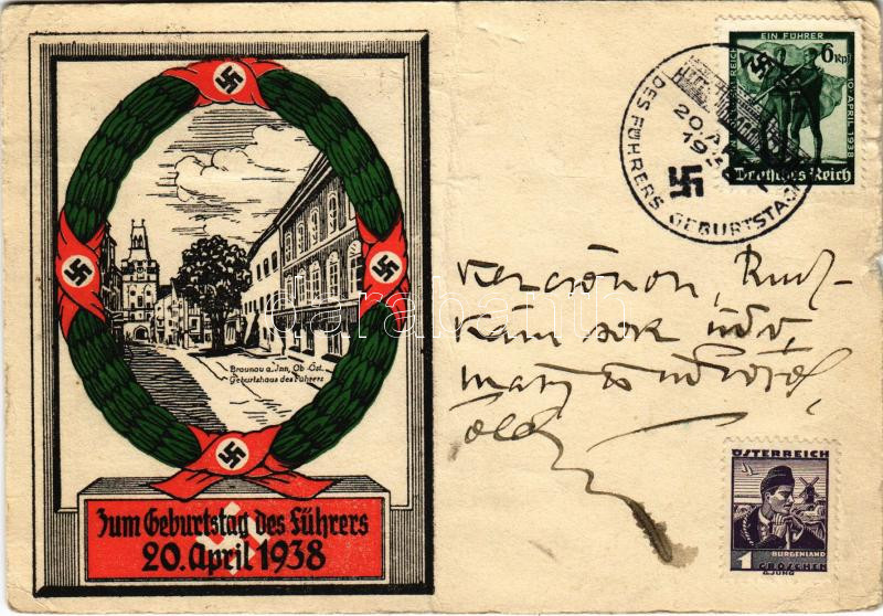 Description: 1938 Zum Geburtstag des Führers. Braunau am Inn, Geburtshaus des Führers / Birthday and birth house of Adolf Hitler, NSDAP German Nazi propaganda + So. Stpl (fa)