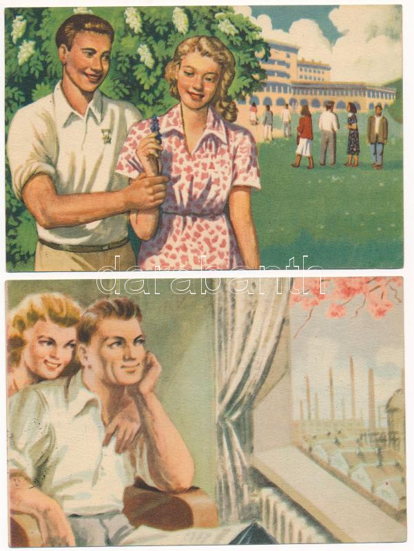 2 db MODERN magyar szocreál propaganda képeslap: munkás párok (Művésze...