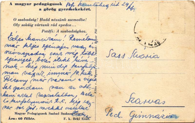 Description: Petőfi: A szabadsághoz. A magyar pedagógusok a görög gyermekekért. Kiadja a Magyar Pedagógusok Szabad Szakszervezete a görög polgárháború miatt menekülők megsegítésére / Hungarian Revolution of 1848, charity card for the refugees of the Greek Civil War (1942-49) (EK)