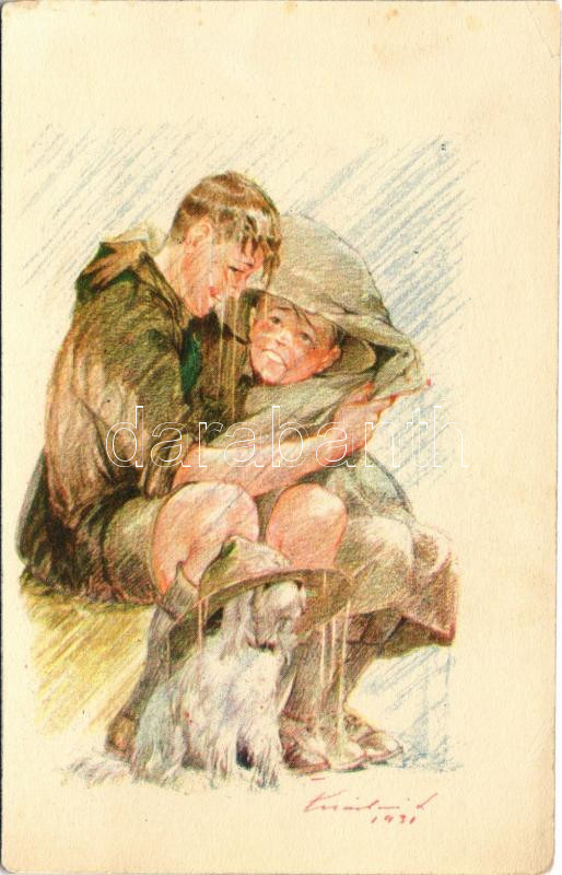 A cserkész másokkal szemben gyengéd. Kiadja a Magyar Cserkészszövetség / Hungarian boy scout art postcard s: Márton L. (r)
