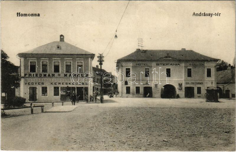 1914 Homonna, Humenné; Andrássy tér, Hotel Stefánia szálloda, bor és s... https://www.darabanth.com/en/429-Online-auction/429.0/Postcards/Slovakia~1500007/1914-Homonna-Humenne-Andrassy-ter-Hotel-Stefania-szalloda-bor-es-sorcsarnok-Friedman-Ma~II2754239