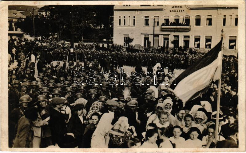 Description: 1938 Ipolyság, Sahy; "A Felvidék felszabadulásának első örömünnepe" bevonulás, Lengyel szálloda, magyar zászló / entry of the Hungarian troops, hotel, Hungarian flag + "1938 AZ ELSŐ VISSZATÉRT MAGYAR VÁROS IPOLYSÁG" So. Stpl. (EK)