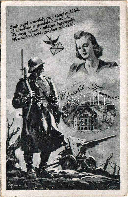 Description: 1943 Kassa, Kosice; Üdvözlet! Csak téged szeretlek, csak téged imádlak... Második világháborús katonai montázs / WWII Hungarian military art postcard, montage s: Sebők (EK)