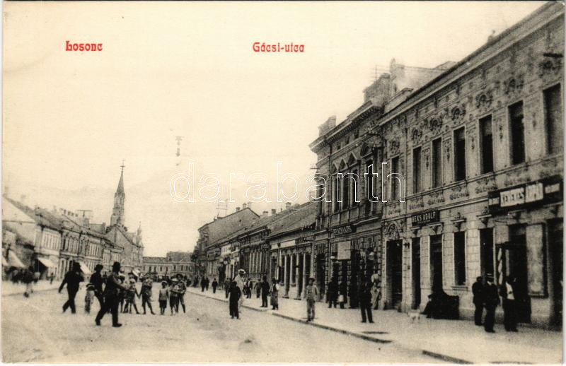 Losonc, Lucenec; Gácsi utca, Kemenes Árpád, Heks Adolf, Belach Lajos üzlete. Bicskei Zoltán kiadása / street view, shops