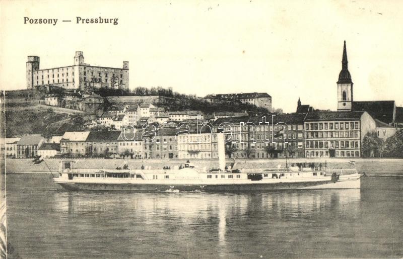 Pozsony, Pressburg, Bratislava; Várhegy, "Hildegarde" lapátkerekes gőzhajó / castle hill, Hildegarde passenger paddle steamer