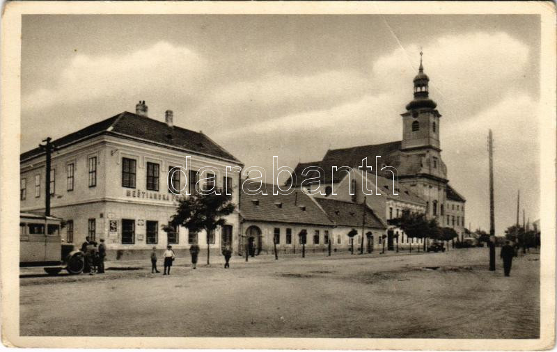 Description: Somorja, Csallóköz-Somorja, Somorin, Samorín; Rim. kat. kostol, Mestianska skola / Szlovák polgári iskola és katolikus templom, automobil / Slovak school, Catholic church, automobile (fa)