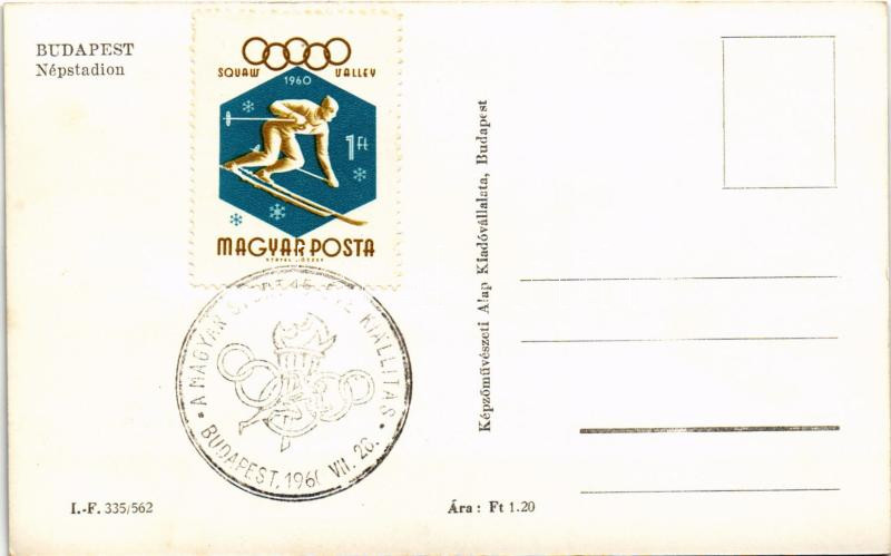 Budapest XIV. Népstadion, labdarúgó mérkőzés, foci. Képzőművészeti Alap Kiadóvállalat + "A MAGYAR SPORT 15 ÉVE KIÁLLÍTÁS BUDAPEST 1960" So. Stpl.