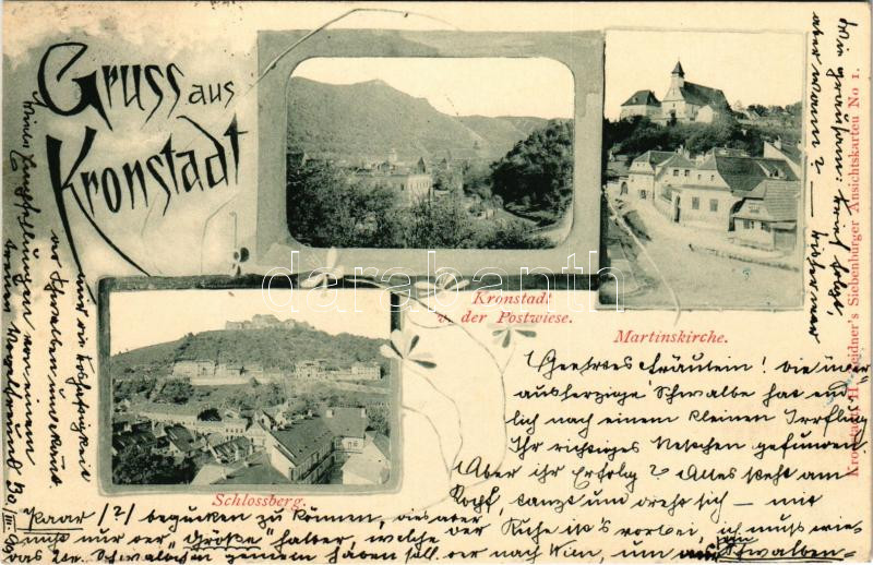 Description: 1899 (Vorläufer) Brassó, Kronstadt, Brasov; Schlossberg, v. der Postwiese, Martinskirche / Fellegvár, Brassó látképe Postarét felől, templom. H. Zeidner kiadása / general view, church. Art Nouveau, floral