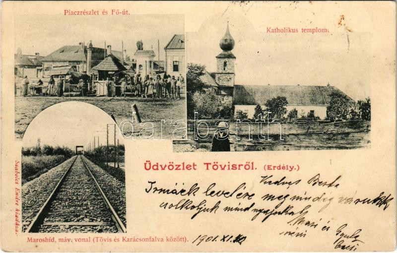 1901 Tövis, Teius; Piac, Fő út, Katolikus templom, Maroshíd, MÁV vasúti vonal Tövis és Karácsonfalva (Homoródkarácsonyfalva) között, dohány és bélyeg üzlet. Szabolcs Endre kiadása / market, main street, church, Mures river bridge, railway line between Teius and Craciunel, tobacco and stamp shop (EB)