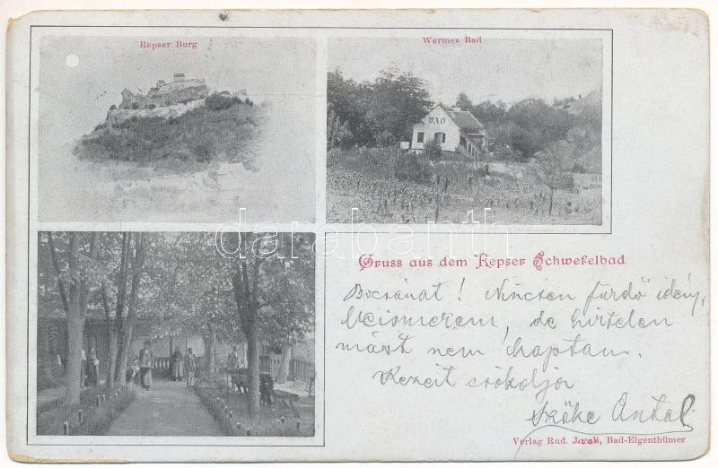 1908 Kőhalom, Reps, Rupea; Repser Burg, Warmes Bad. Gruss aus dem Repser Schwefelbad / vár, meleg fürdő, kénes fürdő, vendéglő. Verlag Rud. Jacobi / castle, warm baths, sulfur spa (EM)
