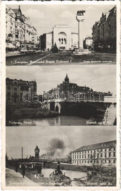 1940 Temesvár, Timisoara; Bulevardul Regele Ferdinand I, Podul Traian, Vedere partiala a Begheului / utca, villamos, üzletek, híd, Béga-part / street view, tram, shops, bridge, riverside
