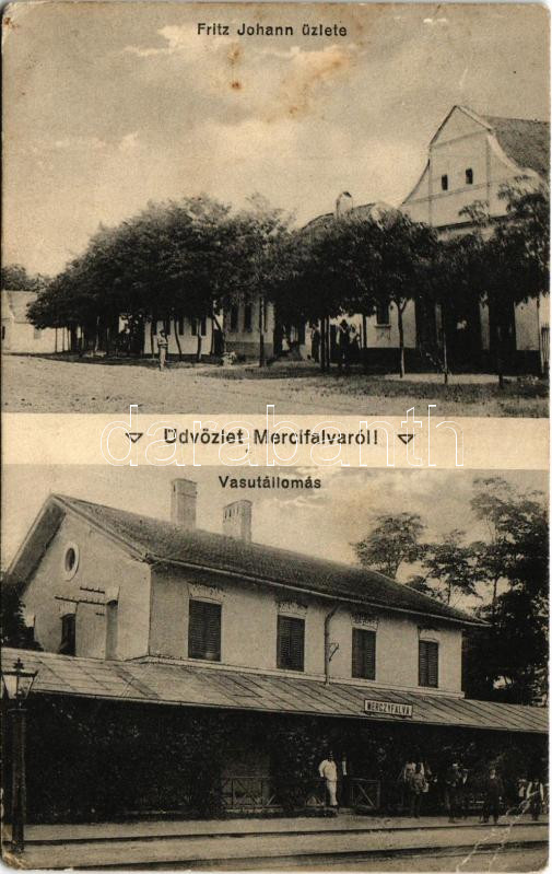 Mercyfalva, Merczyfalva, Merczifalva, Carani, Mertisoara; Fritz Johann üzlete, vasútállomás / shop, railway station (Rb)