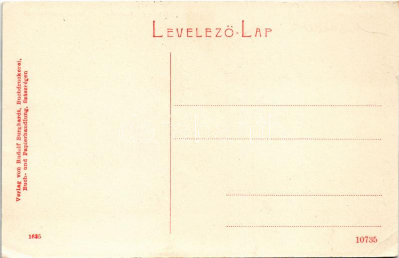 Description: Szászrégen, Reghin; Evangélikus gimnázium, M. kir. dohány és só árulás üzlet. Rudolf Burghardt kiadása 1635. (W.L. ?) / Lutheran school, tobacco and salt shop (EK)