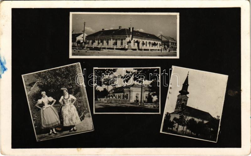 Gombos, Bogojeva; Népviselet, Községháza, Országzászló, Templom, Ármentesítő társulat. Baumgarten Pál kiadása / folklore, town hall, Hungarian flag, church, office (EK)