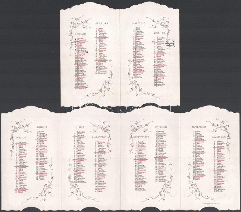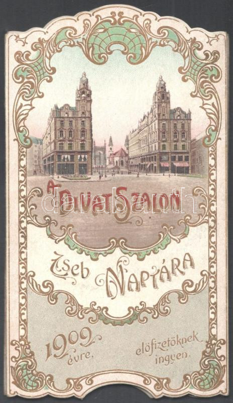 1909 A Divat Szalon zseb-naptára 1909. évre. Szecessziós díszesen litografált összehajtható zsebnaptár / kártyanaptár. Az első képen, a Ferenciek tere, a Klotild-paloták, az Erzsébet-híd és a Belvárosi plébániatemplom képével, utána 4 képen nőalakokkal, az utolsón zenélő puttóval és "Boldog Újévet" felirattal. Berlin, W. Hagelberg. A.G.-ny. két kép leszakadt, de ezt leszámítva jó állapotban, 13x7 cm