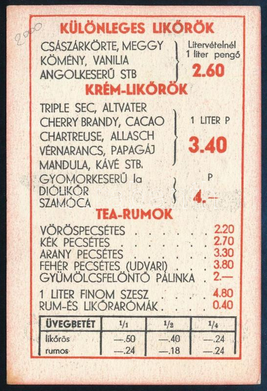 cca 1930-40 Likőrárjegyzék Grünfeld Ernő, Bp. VIII., Orczy-út 24, illu...