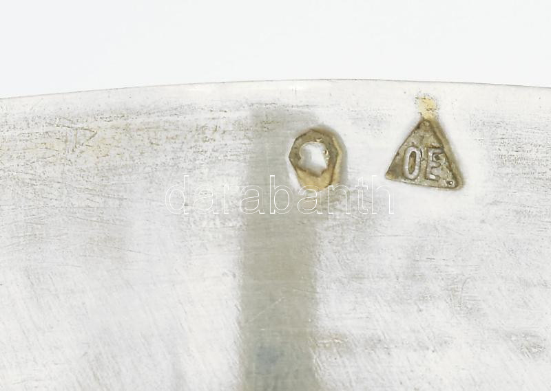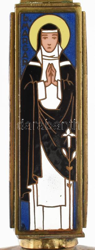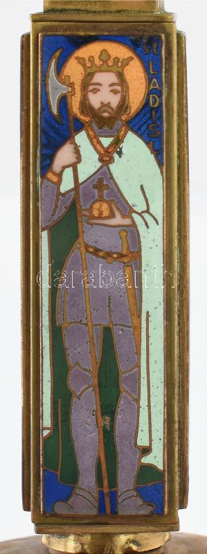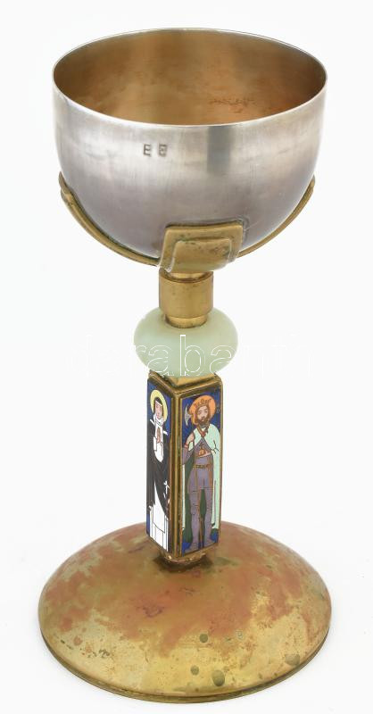 1938 Emlék serleg. "Az Eucharisztikus Világkongresszus és Szent István jubileumi év emlékére készítette a Cserkészbolt Magyar Műötvös műhelyben Barth F. tervei szerint. Példány 32" sorszámozott serleg magyar szentek és boldogok tüzzománc képével, ezüst, réz, tűzzománc. m: 23 cm /// 1938 Commemorative Cup. "Made in memory of the Eucharistic World Congress and the Jubilee Year of Saint Stephen at the Cserkészbolt Hungarian Silver Workshop according to designs by Barth F. This numbered piece features images of Hungarian saints and blesseds in enamel, made of silver, copper, and enamel. Height: 23 cm.