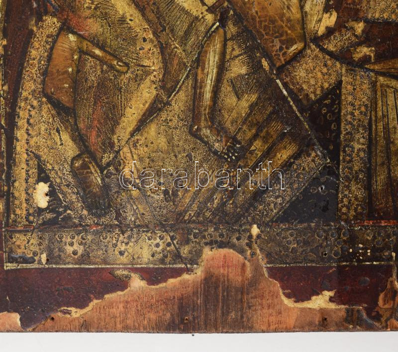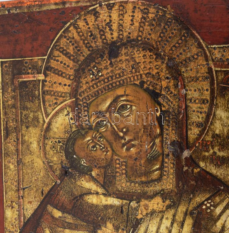 Ikon - Feodorovszkaja Istenszülő. Orosz ikonfestő, cca 19. sz. közepe, tojástempera, fa, sérülésekkel, 28,5x23,5 cm /// Icon - Theotokos of Feodorovskaya. Russian icon painter, circa mid-19th century, egg tempera on wood, with damages, 28.5x23.5 cm. /// A Feodorovszkaja Istenszülő ikontípus a 13. század óta ismert és története összefonódik a Romanov-házzal, azzal a dinasztiával, amely több mint 300 évig uralkodott Oroszországban. A hagyomány szerint az ikon csodás erejűnek számított, különösen a városok védelmében és a királyi családok irányításában.