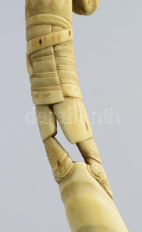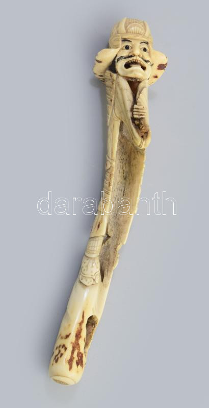 Kiseruzutsu. Senryu típus, samurai alakkal díszített, Meidzsi-kor, feltehetően faragott szarvascsont, h: 19 cm /// Kiseruzutsu. Senryu type, decorated with a samurai figure, Meiji era, presumably carved from antler, height: 19 cm.