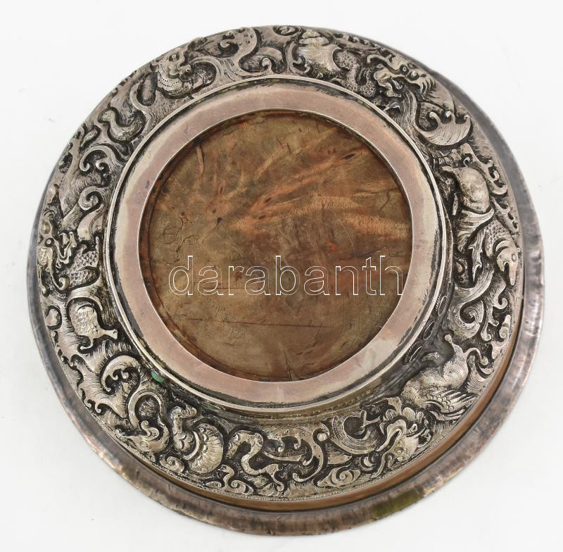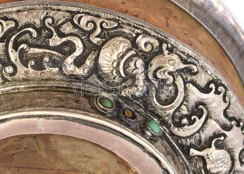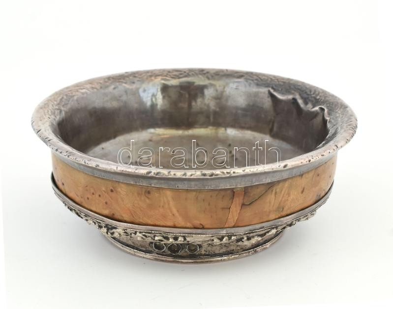 Tibeti buddhista koldulótál. Fa, ezüst (Ag), Tibet, cca 19. sz. közepe - második fele, d: 13,5 cm, m: 5 cm, bruttó: 249g /// Tibetan Buddhist alms bowl. Wood, silver (Ag), Tibet, circa mid to late 19th century, diameter: 13.5 cm, height: 5 cm, weight: 249g.