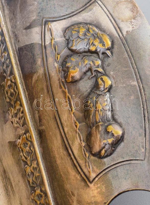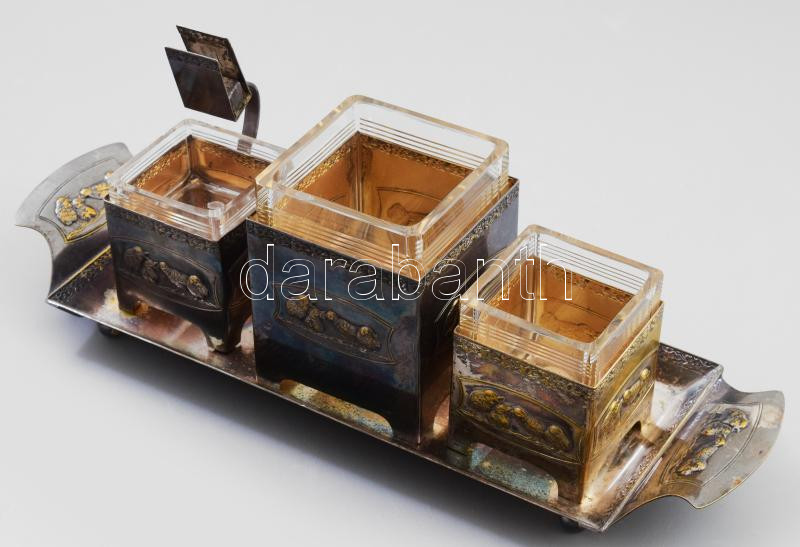 cca 1910, Angol art nouveau ezüstözött alpakka dohányzó készlet tálcán, fiókáit etető madárka mintájával díszítve. Jelzett: W&G (Watson & Gillott?), eredeti üvegbetétekkel, kopással, tálca 40x13 cm, m: 9-15 cm /// Circa 1910, English Art Nouveau silver-plated alpaca smoking set on a tray, decorated with a pattern of a bird feeding its chicks. Marked: W&G (Watson & Gillott?), with original glass inserts, showing wear, tray size: 40x13 cm, height: 9-15 cm.