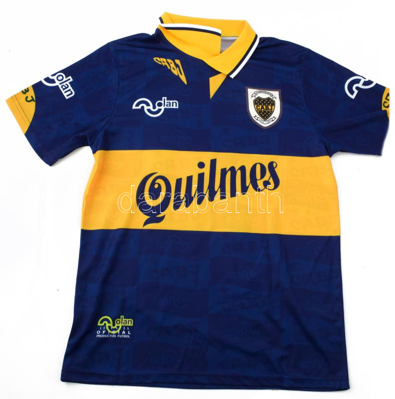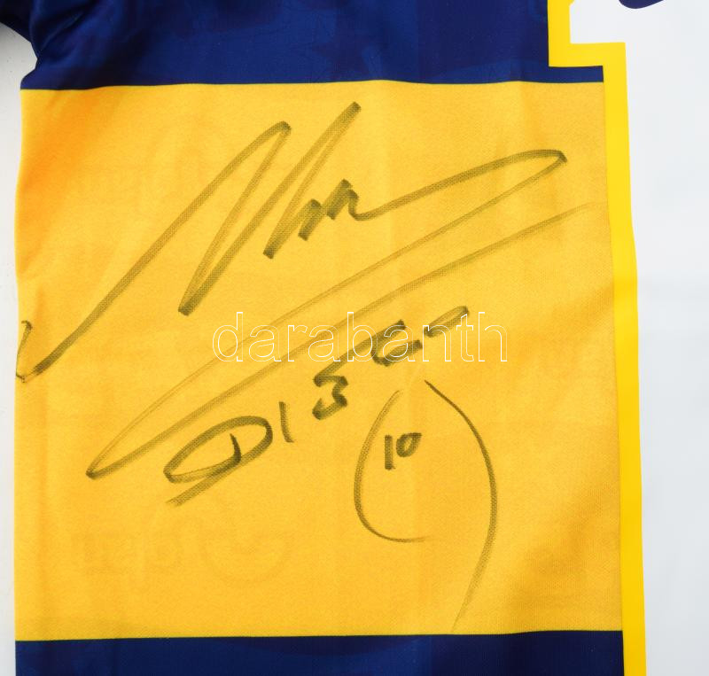 Description: Diego Maradona (1960-2020) legendás labdarúgó autográf aláírása Boca Juniors szurkolói mezén. / Autograph signature of the legendary footballer Diego Maradona (1960-2020) on a Boca Juniors fan shirt.