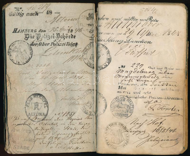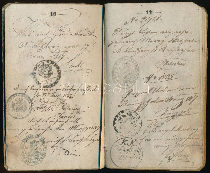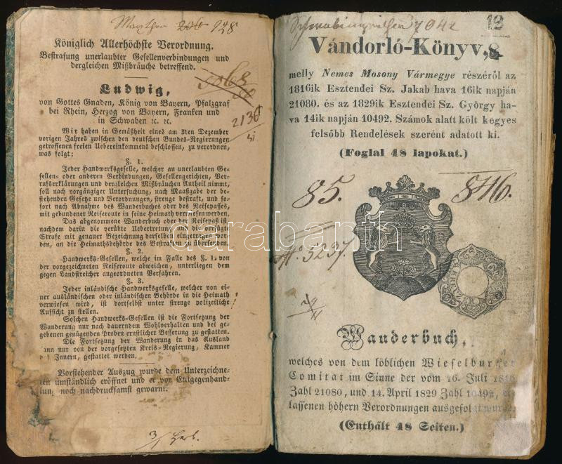 1846-1853 Vándorlókönyv magyaróvári születésű Wolfram Henrik rézműves részére, több mint 150 bejegyzéssel és bélyegzéssel, 48 lap után 26 számozatlan oldalú pótlapon, klf. helyekről, többek közt Moson (Wieselburg), Magyaróvár (Ung. Altenburg), Pozsony (Pressburg), Sopron (Oedenburg) papírfelzettel és további osztrák v. német városok (Bamberg, Magdeburg, Bayreuth, Innsbruck, Augsburg, Hannover, Lipcse, Ulm, Speyer, Landshut stb.) bejegyzéseivel, korabeli, kissé sérült kartonált kötésben, néhány lap széle sérült, részben javított.