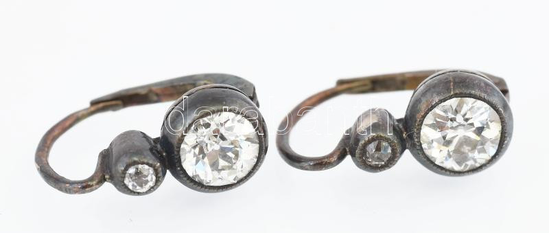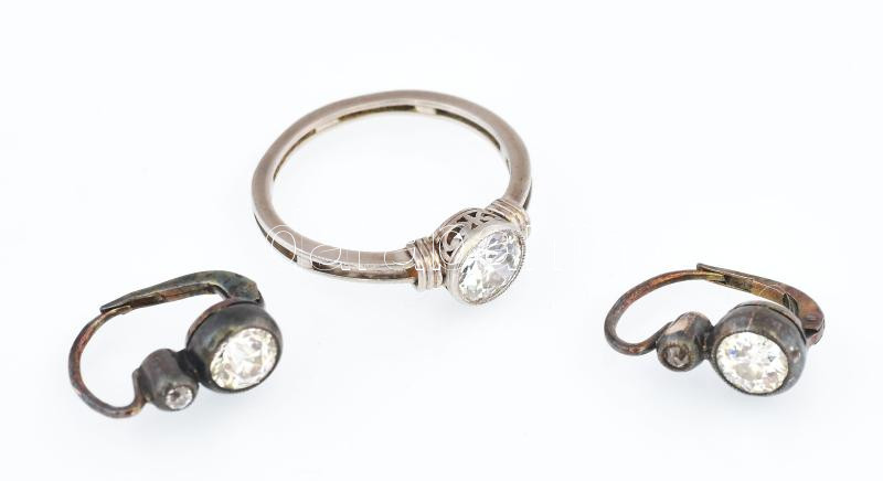 Arany fehérarany (Au) 14K gyűrű 0,75 ct gyémánttal kerek csiszolás, VS1, jelzés nélkül, méret: 55, és arany (Au) 14K fülbevalópár 2 db gyémánttal (0,05 és 0,5 ct VS1-2) ezüst(Ag) foglalatban, jelzés nélkül, bruttó: 6,1 g