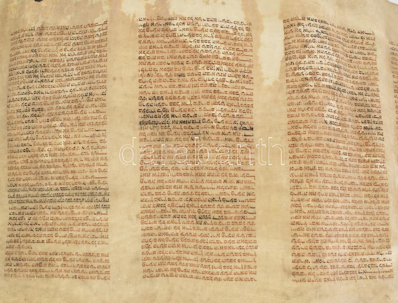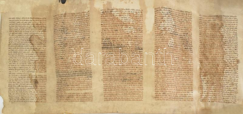 József és a fáraó története. Tóra töredék, állati bőrből készített pergamenen, foltokkal, feltekerve, kézzel írt. 63x30 cm