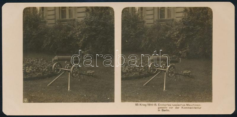 1915 Zsákmányolt orosz géppuska az I. világháború korai korszakában, sztereófotó, hátoldalon debreceni üzlet pecsétjével, jó állapotban, 8,5×18 cm