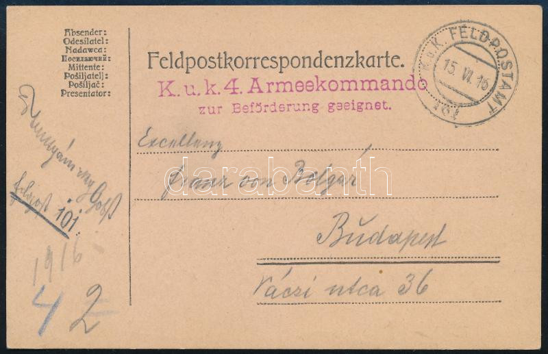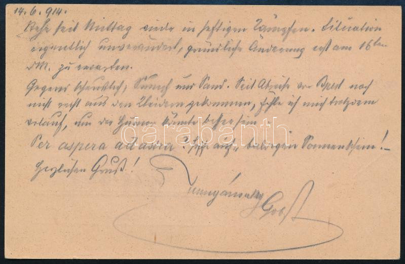 1916 Nádasi Tersztyánszky Károly (1854-1921) vezérezredes, világháborús hadvezér saját kézzel írt tábori postai levelezőlapja Budapestre küldve