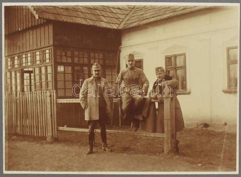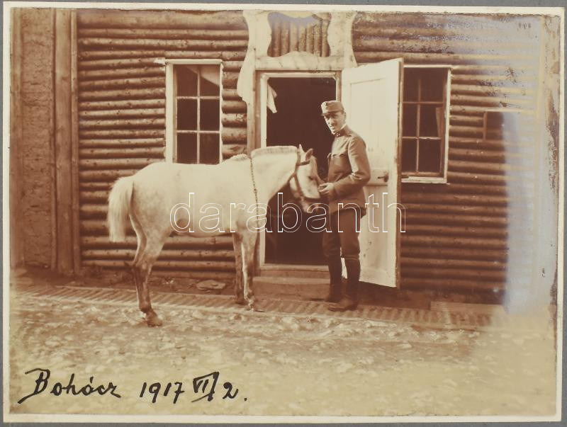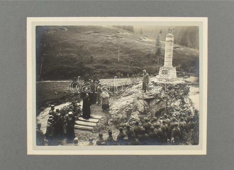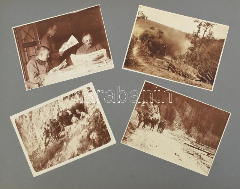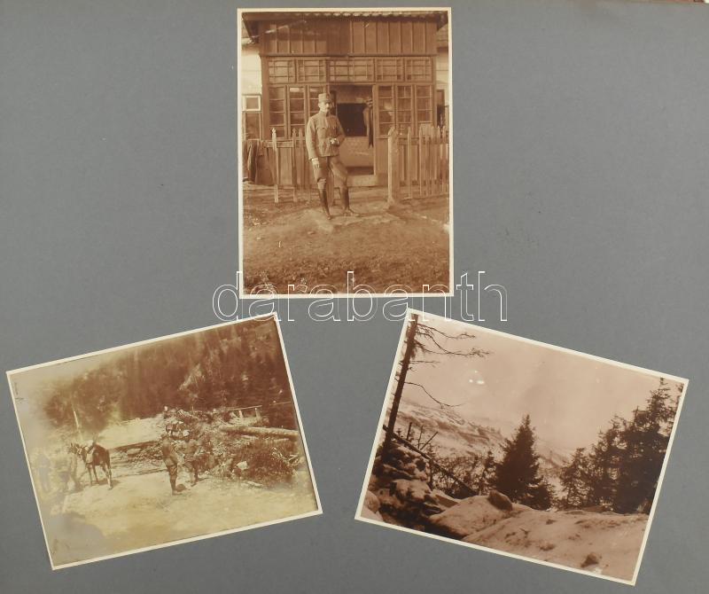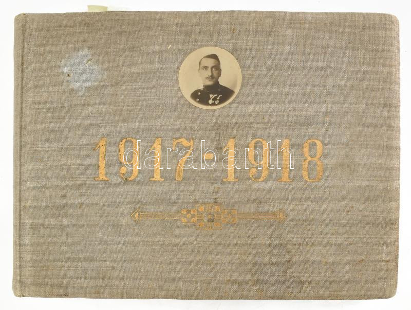 1917-1918 I. világháborús katonai fényképalbum 175 db fényképpel. Az album elején a szabadkai 6-os honvéd gyalogezred emlékoszlopának felszentelése, ezért valószÃnű a ezred egy tisztjének albuma. Biztosan a 40. honvéd hadosztályának egyik alegysége, a fotókon szereplÅ‘ katonákon sok fokosos sapkajelvény van. A fényképek változatos témájúak, lövészárok, pilóták sÃrja, lángszóróval rohamozó katonák, segélyhely, romok, tábori kápolna, stb.