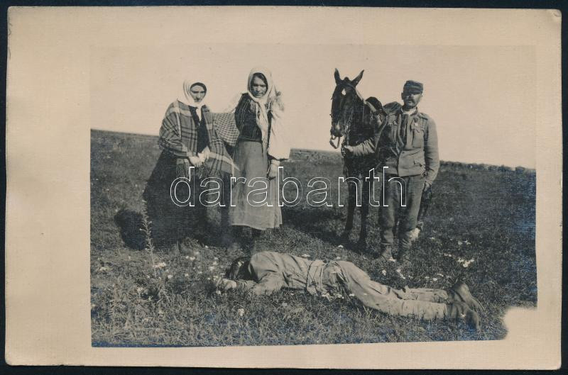 1917 Agyonlőtt bolseviki (orosz) katona a fronton, mellette magyar lov...