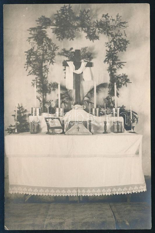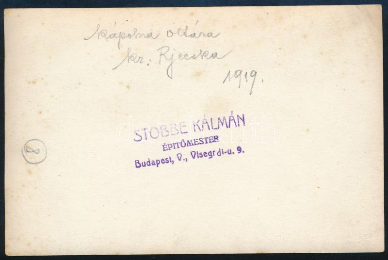 1919 A Krasznaja Recska, Rjecska, Krasnaia- Rjetschka (Vladivostok) hadifogoly tárbo kápolnája feliratozott fotó Stobbe Kálmán (1883-1936) építőmester, díszlettervező, labdarúgó, a magyar válogatott edzője pecséttel jelzett, feliratozott fotója, / Krasnaia- Rjetschka (Vladivostok) Japanese-Russian POW (prisoner of war) camp chapel.. Stamped and inscribed photo of Kálmán Stobbe (1883-1936) builder, set designer, footballer, coach of the Hungarian national team 15x10 cm