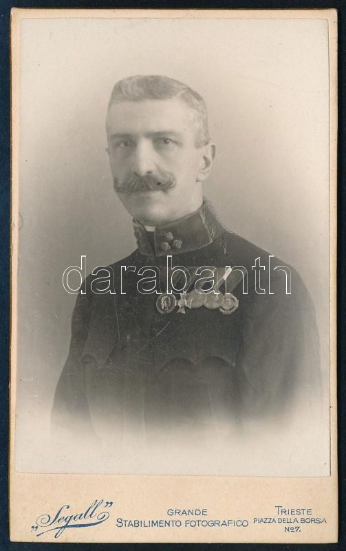 cca 1910 Katonai tisztviselő fotója, számos kitüntetéssel, a hátoldalon autográf sorokkal, keményhátú fotó, Trieste, "Segall", 10x6 cm