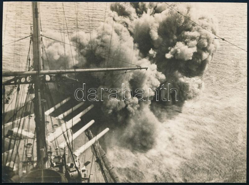cca 1914-1918 Az elülső 30,5 cm-es ágyúk sortüze az Osztrák-Magyar Cs. és Kir. Haditengerészet (K. u. k. Kriegsmarine) egyik Tegetthoff-osztályú dreadnought csatahajóján, I. világháborús fotó, a hátoldalon feliratozva, jó állapotban, 16x11,5 cm. A Tegetthoff-osztály négy hadihajója (SMS Viribus Unitis, SMS Tegetthoff, SMS Prinz Eugen és SMS Szent István) az Osztrák-Magyar Haditengerészet egyedüli dreadnought csatahajóiként rendkívül korszerűnek számítottak, különösen tűzerő tekintetében. A hajók elsődleges fegyverzetét a négy lövegtoronyban hármasával elhelyezett 12 db 30,5 cm-es (305 mm-es) űrméretű, Škoda 30.5 cm L/45 K10 típusú löveg alkotta, melyeket 12 db (szintén Škoda gyártmányú) 15 cm-es ágyú, illetve további, kisebb kaliberű fegyverek, légvédelmi ágyúk és gépágyúk egészítettek ki. Mindezek mellett 4 db 533 mm-es torpedóvető csővel is fel voltak szerelve (egy-egy a hajó orrában, tatjában, és mindkét oldalán), melyekhez általában hajónként 12 torpedót tároltak. // cca 1914-1918 Salvo from the front 30.5 cm guns of a Tegetthoff-class dreadnought battleship of the Austro-Hungarian Navy (K. u. k. Kriegsmarine), WWI photo, with description on the reverse, in good condition, 16x11.5 cm. As the only dreadnought battleships of the Austro-Hungarian Navy, the four Tegetthoff-class warships (SMS Viribus Unitis, SMS Tegetthoff, SMS Prinz Eugen and SMS Szent István) were considered state-of-the-art, particularly in terms of firepower. The ships' main armament consisted of twelve Škoda 30.5 cm L/45 K10 guns mounted in four triple turrets, which were supplemented by twelve 15 cm guns (also manufactured by Škoda), as well as other smaller-caliber weapons, anti-aircraft guns and machine guns. Furthermore, each ship was fitted with four 533 mm torpedo tubes (one each in the bow, the stern, and both sides), for which they usually carried 12 torpedoes.