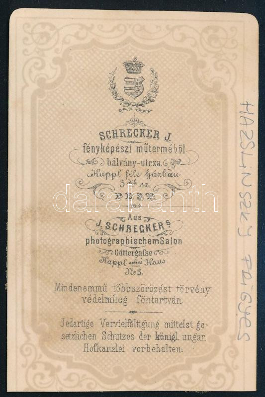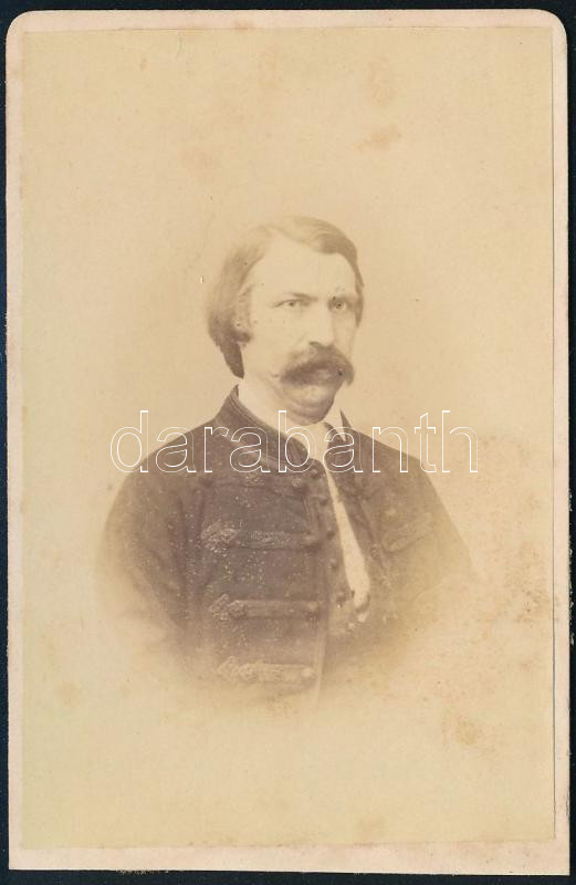 Description: 1865 Hazslinszky Frigyes (1818-1896) magyar botanikus, életműve úttörő jelentőségű a magyar moszatok, gombák, zuzmók és mohák feltárásában, leírásába és növénytani feldolgozásában, MTA tagja, keményhátú fotó Schrecker Ignác (1834-1888) pesti műterméből, 10×6 cm