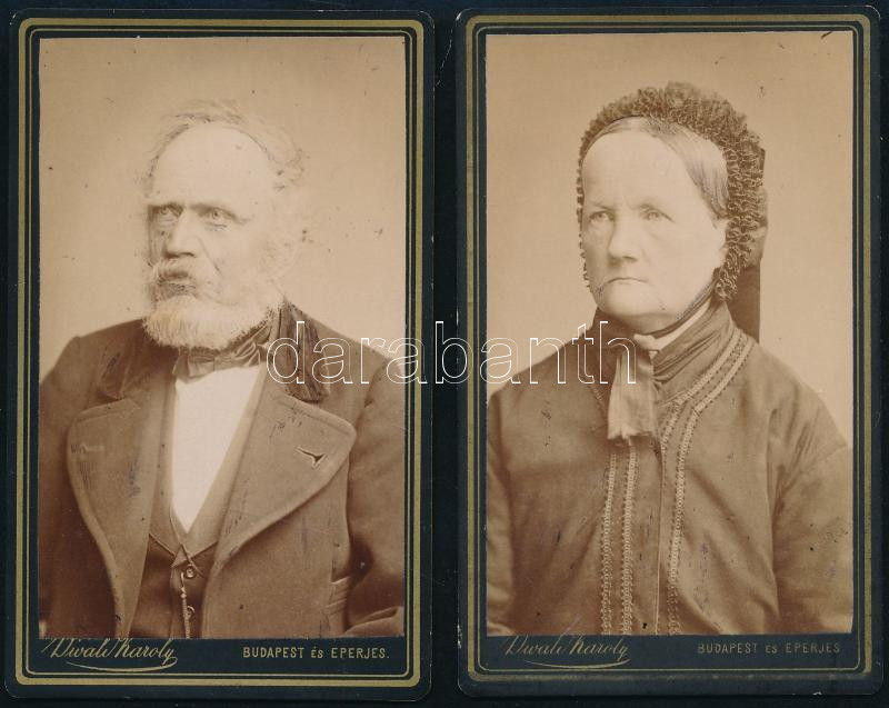 1885 Husz Dávid (1813-1889) vendéglős, lokálpatrióta és felesége, 2 db keményhátú fotó Divald Károly eperjesi műterméből, 10,5×6,5 cm