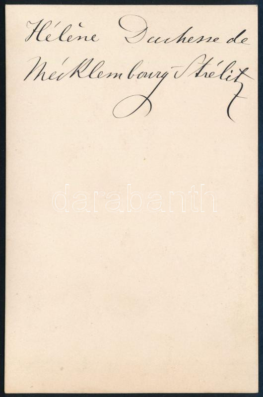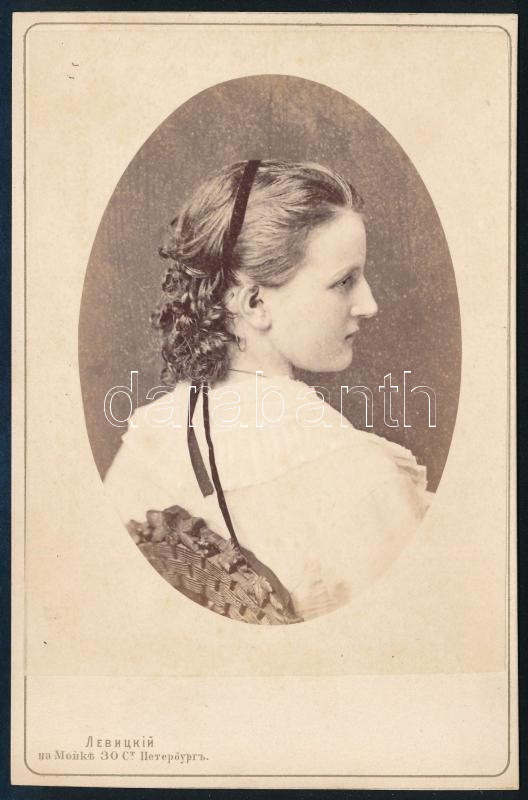 cca 1870-1875 Ilona (Helene) mecklenburg-strelitzi hercegnő (1857-1936) fiatalkori portréja; György mecklenburg-strelitzi nagyherceg és Jekatyerina Mihajlovna Romanova orosz nagyhercegnő gyermekeként Szentpéterváron született (a fénykép is itt készült). Kabinetfotó Szergej Levitsky (1819-1898) orosz fényképész szentpétervári műterméből (az orosz fényképészet egyik atyja, a kor európai szinten is neves fotográfusa; 1849-ben szülővárosában, Szentpéterváron nyitotta meg műtermét, amely Oroszország első jelentős fényképészeti műtermeinek egyike volt; 1859 és 1864 között Párizsban is műtermet üzemeltetett saját neve alatt); a hátoldalon feliratozva, jó állapotban, 16,5x10,5 cm // cca 1870-1875 Duchess Helene of Mecklenburg-Strelitz (1857-1936) at a young age; as the daughter Duke Georg August of Mecklenburg-Strelitz and Grand Duchess Catherine Mikhailovna of Russia, she was born in Saint Petersburg (the portrait was also taken there). Cabinet card from the studio of Russian photographer Sergey Levitsky (1819-1898) in St. Petersburg (one of the patriarchs of Russian photography, and an influential European photographer of the time; he opened his studio in St. Petersburg in 1849, which was one of the first major photographic studios in Russia; he also operated a studio in Paris between 1859 and 1864); with description on the reverse, in good condition, 16.5x10.5 cm