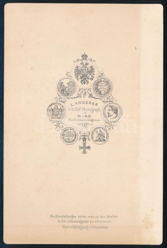 cca 1870-1875 kéthelyi gróf Hunyady Júlia (1831-1919), III. Obrenovics Mihály szerb fejedelem felesége; férje 1868-as meggyilkolása után hét és fél évig özvegy maradt (a képen is özvegyi gyászruhában látható); majd 1876-ban szeretőjéhez, Arenberg Károly herceghez ment férjhez. Kabinetfotó Ludwig Angerer cs. kir. udvari fényképész bécsi műterméből, jó állapotban, 16,5x10,5 cm // cca 1870-1875 Countess Júlia Hunyady de Kéthely (1831-1919), wife of Mihailo Obrenović III, Prince of Serbia; after his assassination in 1868, she remained a widow for seven and a half years (she is seen wearing a mourning dress in the picture as well); afterwards, she married her lover, Duke Karl of Arenberg in 1876. Cabinet card from the studio of Ludwig Angerer in Vienna (Wien), in good condition, 16.5x10.5 cm