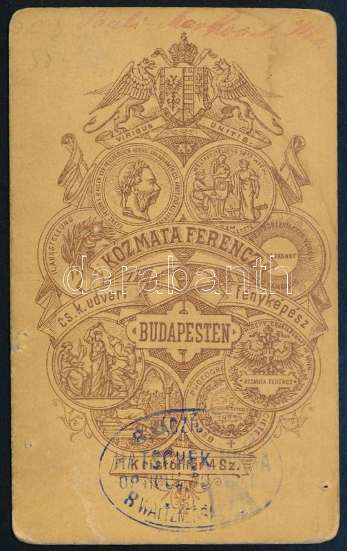 Description: cca 1875 Pauliné Markovits (Markovics) Ilka (1839-1915) opera-énekesnő (szoprán), vizitkártya Kozmata Ferenc (1839-1902) budapesti műterméből, a hátoldalon feliratozva, pecséttel, kis felületi sérüléssel, apró lyukakkal, 10x6 cm