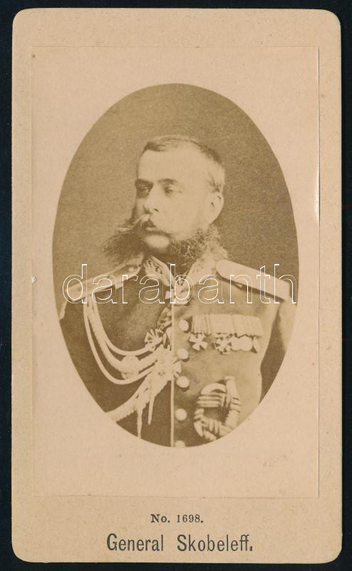 cca 1880 Mihail Dimitrijevics Szkobelev (vagy Szkobeleff) (1843-1882) orosz tábornok; legfőbb katonai érdemei Közép-Ázsia meghódítása, valamint az orosz-török háború (1877-78) során végrehajtott hőstettei voltak; vizitkártya, 10x6 cm / cca 1880 Mikhail Dmitriyevich Skobelev (or Skobeleff) (1843-1882) Russian general; his greatest military feats were his conquest of Central Asia, and his heroic deeds during the Russo-Turkish War (1877-78); CDV photo, 10x6 cm
