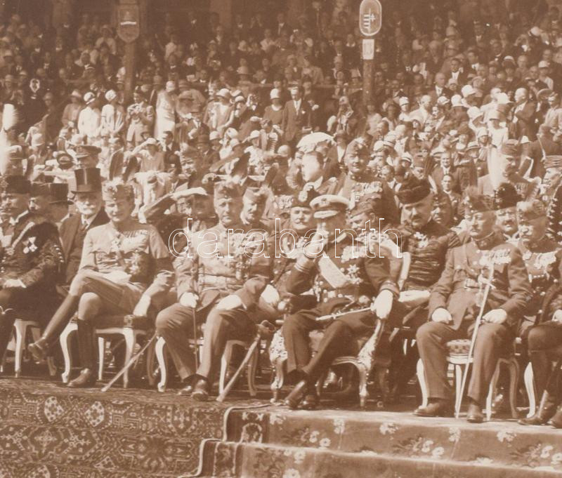 cca 1920-1930 Ünnepség alkalmából felállított díszpáholy, az első sorban Horthy Miklós kormányzó, Barsy Aladár miniszterelnökségi osztálytanácsos és más kormánytisztviselők, méltóságok társaságában; nagyméretű, kartonra kasírozott fotó, Schäffer Ármin budapesti fényképész műterméből, a hátoldalon pecséttel jelzett, sérült kartonon, 24x38,5 cm, teljes méret: 33x49,5 cm