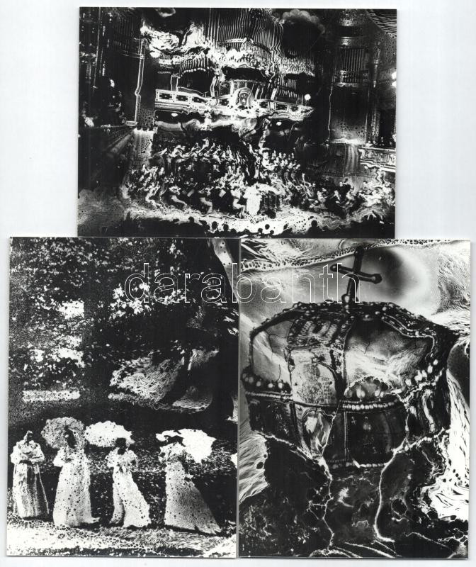 Description: cca 1975 Matz Károly budapesti fotóművész különleges technikával létrehozott fotóművészeti alkotásai (Herkulesfürdői emlék; Magyar korona; Koncert a Zeneakadémia nagytermében), 3 db vintage fotó, egy kép jelzett, ezüst zselatinos fotópapíron, 18x13 cm