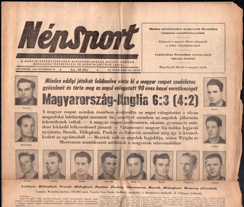 Description: 1953 Magyarország: Anglia 6:3. A legendás meccsről tudósító Népsport 1953. nov. 26., IX. évf. 236. száma. A címlapon az Aranycsapat tagjainak fotóival, beszámolóval. (Bp.),Szikra-ny., szakadásokkal, hajtott, 4 p.