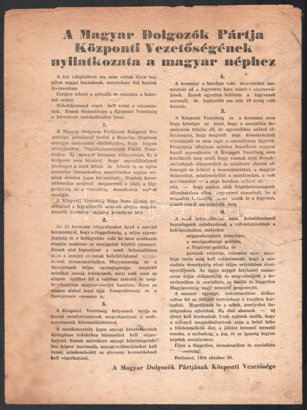 1956.X.26 A Magyar Dolgozók Pártja Központi Vezetőségének nyilatkozata a magyar néphez, röplap, hajtott, lapszéli szakadásokkal, kissé foltos