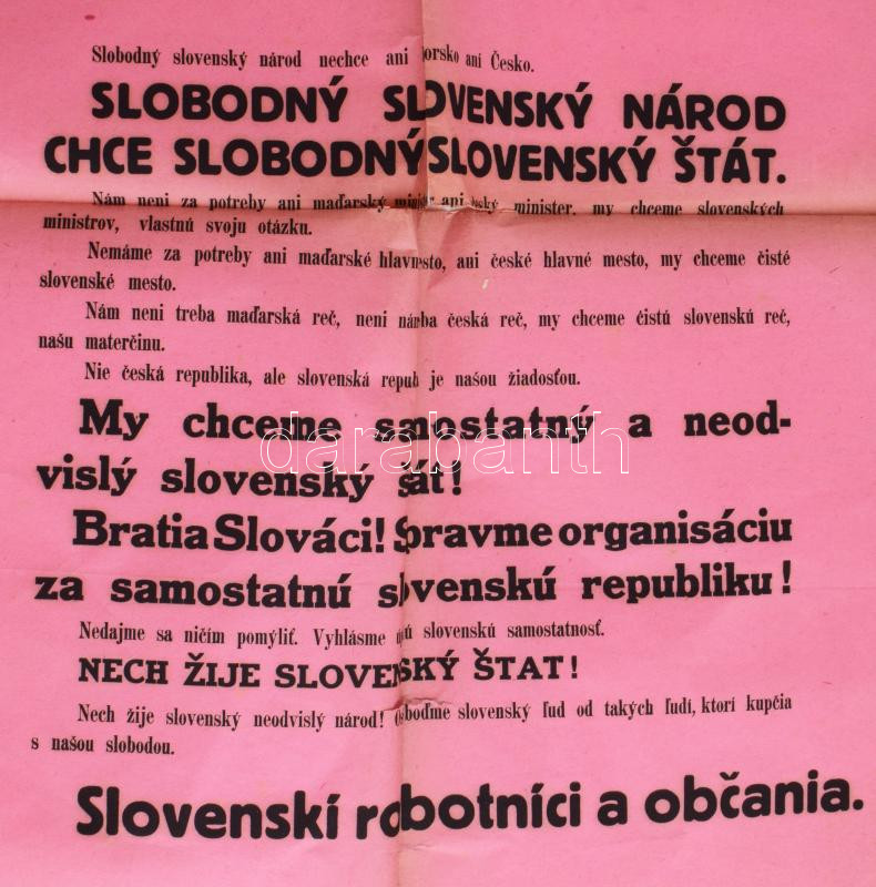cca 1918 Slovensku Republiku! - Szlovák Köztársaságot! Független Szlov... https://www.darabanth.com/en/43-Major-auction/43.1/Art-sculptures-paper-and-other-collectibles/Printed-Materials~17566/cca-1918-Slovensku-Republiku-Szlovak-Koztarsasagot-Fuggetlen-Szlovakiert-kiallo-plakat~II3203891